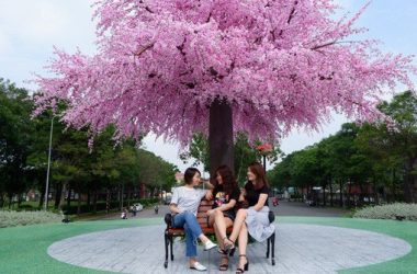 Thảm cỏ xanh mát, hồ nước lung linh, khu vườn mùa xuân rực rỡ hoa mai – hoa đào, ánh đèn trang trí huyền ảo...