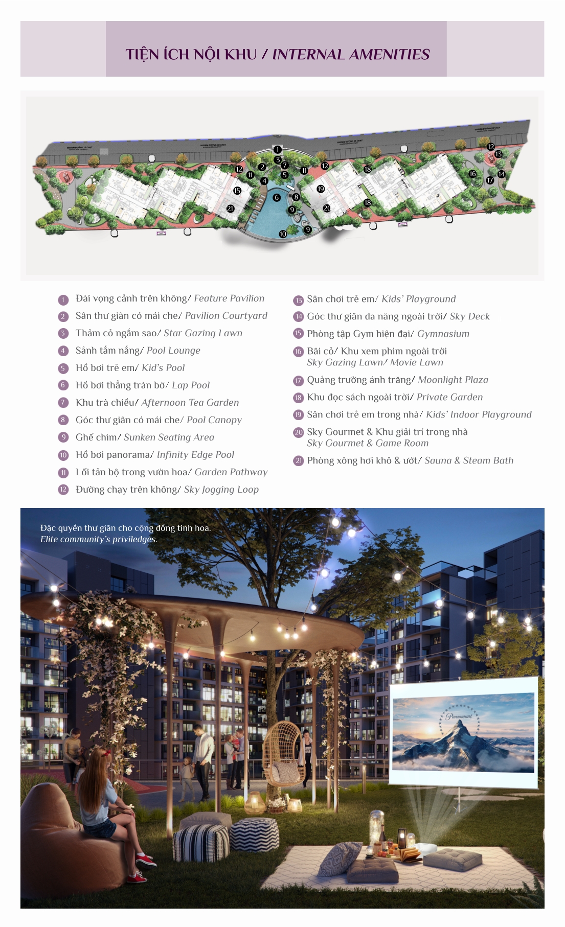 Hệ thống tiện ích đẳng cấp với 22 tiện ích, Sky Lounge tại tầng 12 và 13, cùng khu công viên và cảnh quan rộng hơn 4ha ngay trong khuôn viên nội bộ.